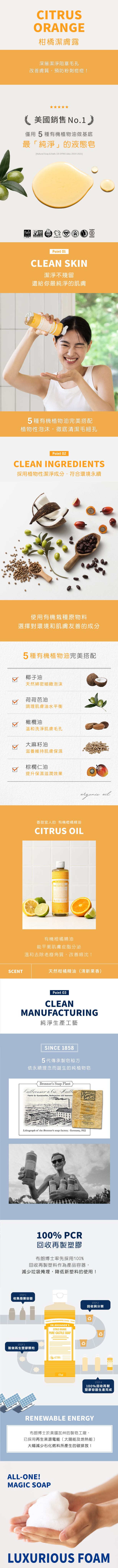 用布朗博士柑橘液體皂點亮您的每一天,它蘊含活力四射的有機橙子、檸檬和青檸精油,帶來清爽提神的清潔體驗。這款香皂採用再生有機認證® (Regenerative Organic Certified®) 精油製成,泡沫豐富順滑,易於沖洗,讓您倍感清新煥發。不含洗滌劑、染料或添加發泡劑-僅採用 符合道德標準的原料。純植物成分,採用有機精油製成,符合公平貿易標準,並獲得 EWG Verified® 認證,帶來煥然一新的清潔體驗,對您和地球都有益!