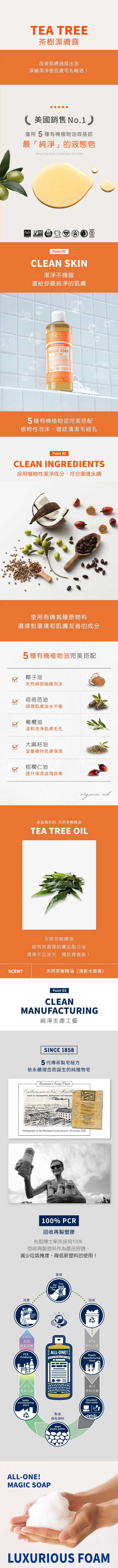使用布朗博士茶樹液體皂,煥發身心,煥然一新。這款神奇皂蘊含純正茶樹精華,香氛縈繞,深層清潔,讓肌膚煥然一新。它能產生豐富滑順的泡沫,輕鬆沖洗乾淨,讓肌膚倍感清新活力。本產品採用再生有機認證®植物油製成,並採用符合倫理道德的有機原料精製而成-不含洗滌劑、染料或添加發泡劑。本產品符合素食主義標準,採用有機油製成,符合公平貿易標準,並獲得EWG®認證-因為潔淨的肌膚始於優質成分。