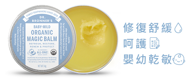 布朗博士 Dr.Bronner's 溫和嬰兒萬用神奇膏 (0.5oz/14g ) 各種肌膚皆可使用,原味無香富含雙倍滋潤配方,產後護理中心特別推薦敏感性及嬰幼兒使用。