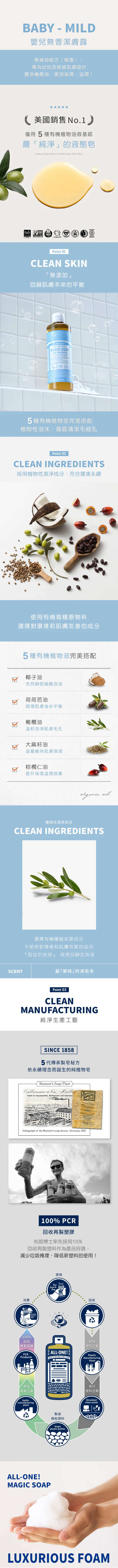 溫和有效,布朗博士嬰兒無香型液體皂,敏感肌膚也能安心使用。這款香皂採用滋養的再生有機認證®精油和雙倍橄欖油配方,能夠產生豐富奢華的泡沫,並輕鬆沖洗乾淨。無添加香精,非常適合嬰兒(稀釋後)和任何對氣味敏感的人。採用符合倫理道德的有機原料精製而成,不含洗滌劑、染料或發泡劑。純植物成分,採用有機油製成,符合公平貿易標準,並獲得EWG®認證,為您和您的家人提供更安全、更永續的清潔體驗!