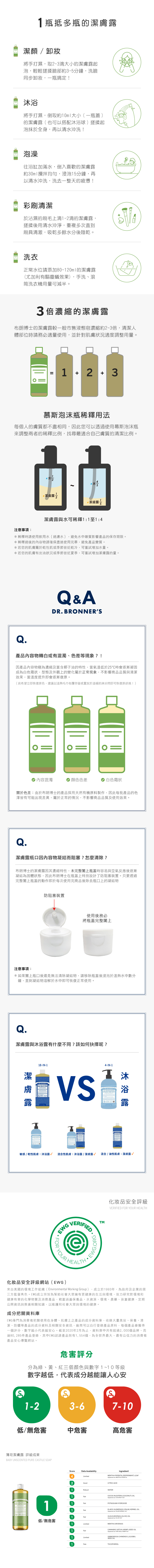 布朗博士皂濃縮、可生物降解、用途廣泛且功效顯著。採用有機及經公平貿易認證的原料製成,採用100%消費後回收瓶包裝。多效合一!