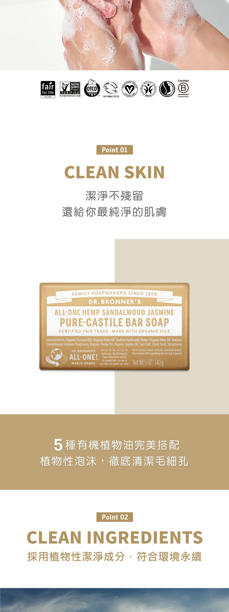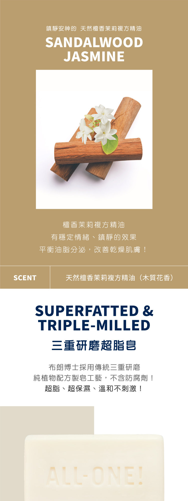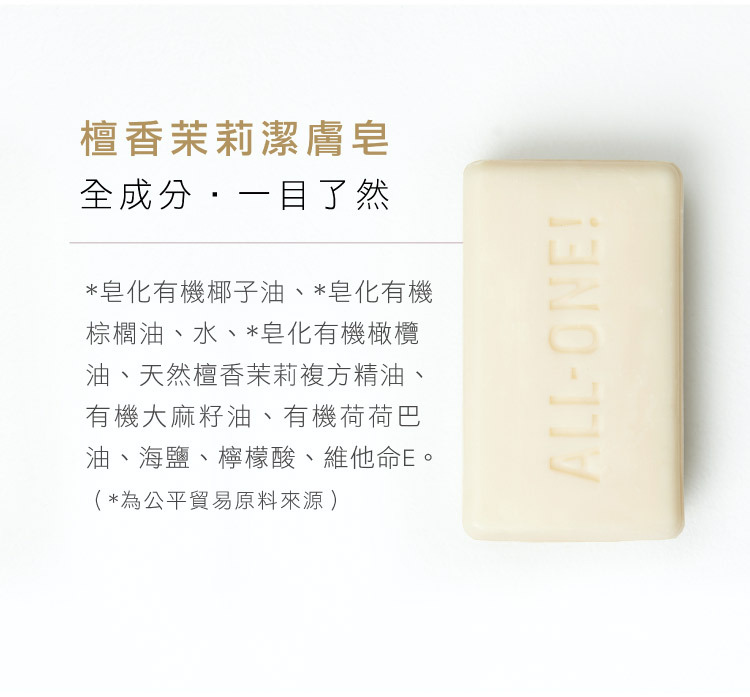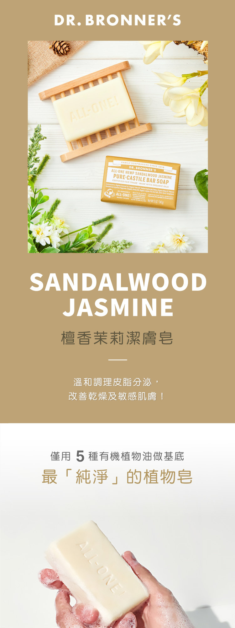溫暖而木質,帶有新鮮的茉莉花香調 - 我們的檀香茉莉香皂採用經過認證的公平貿易成分和有機大麻油製成,泡沫柔軟順滑,不會使您的皮膚乾燥。
