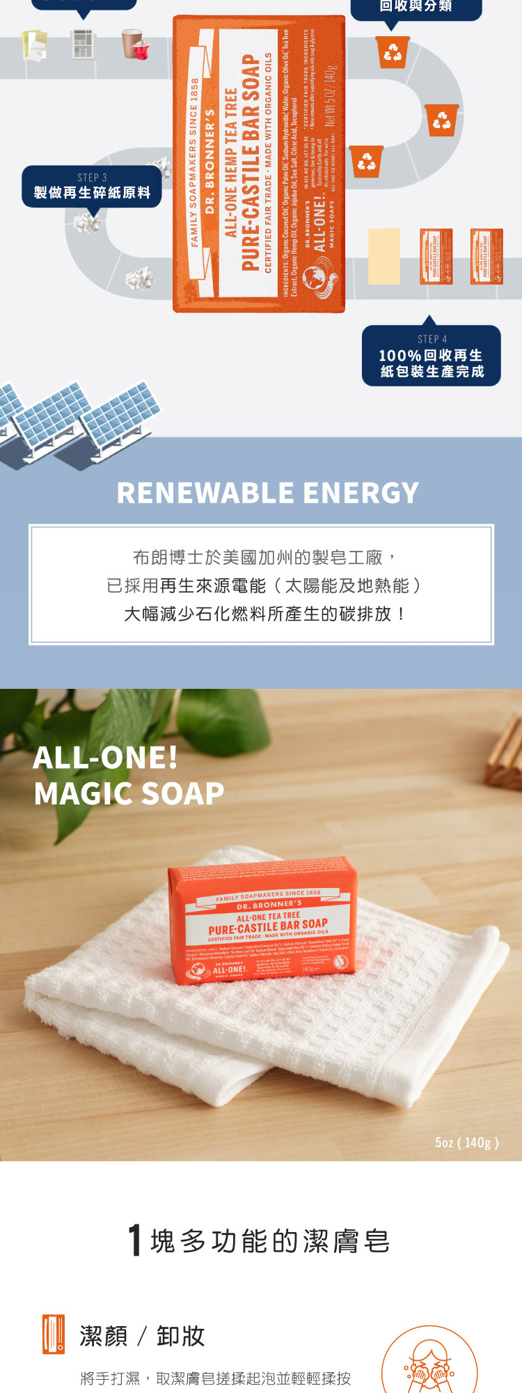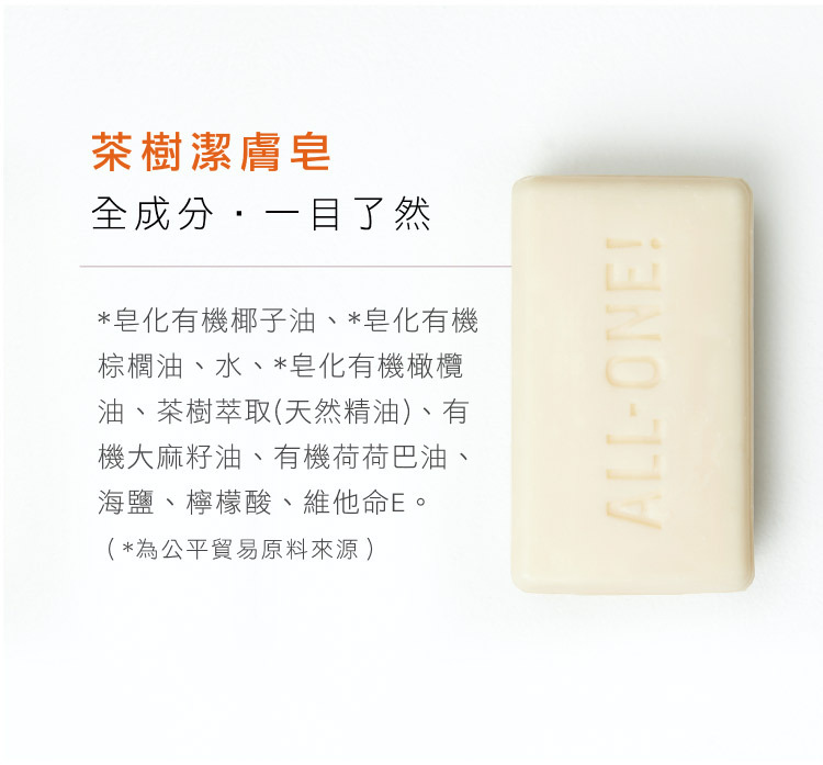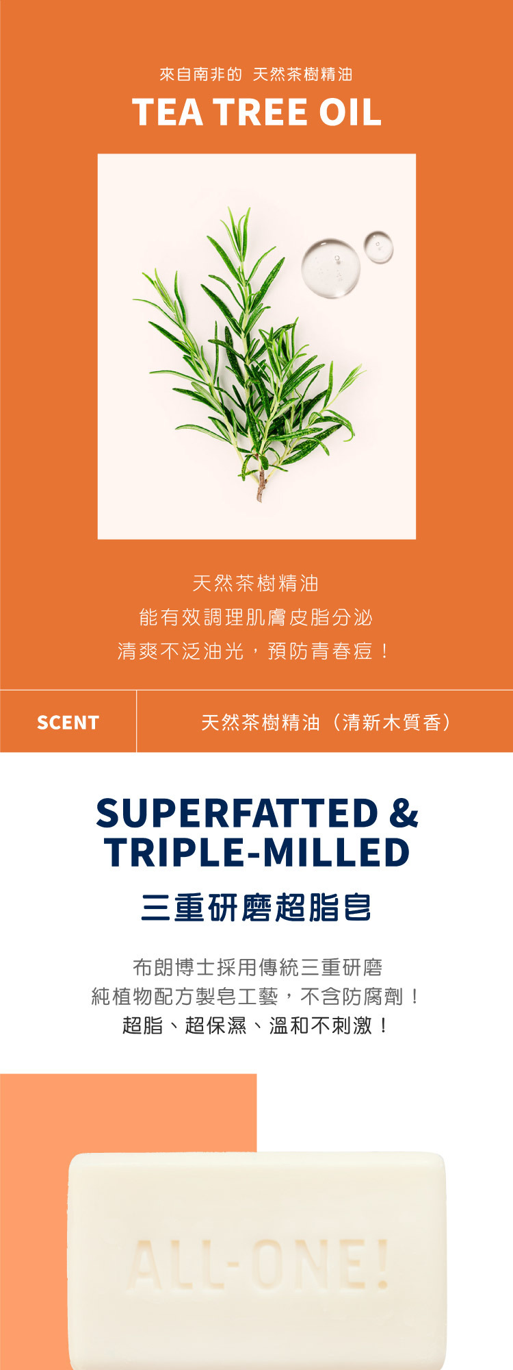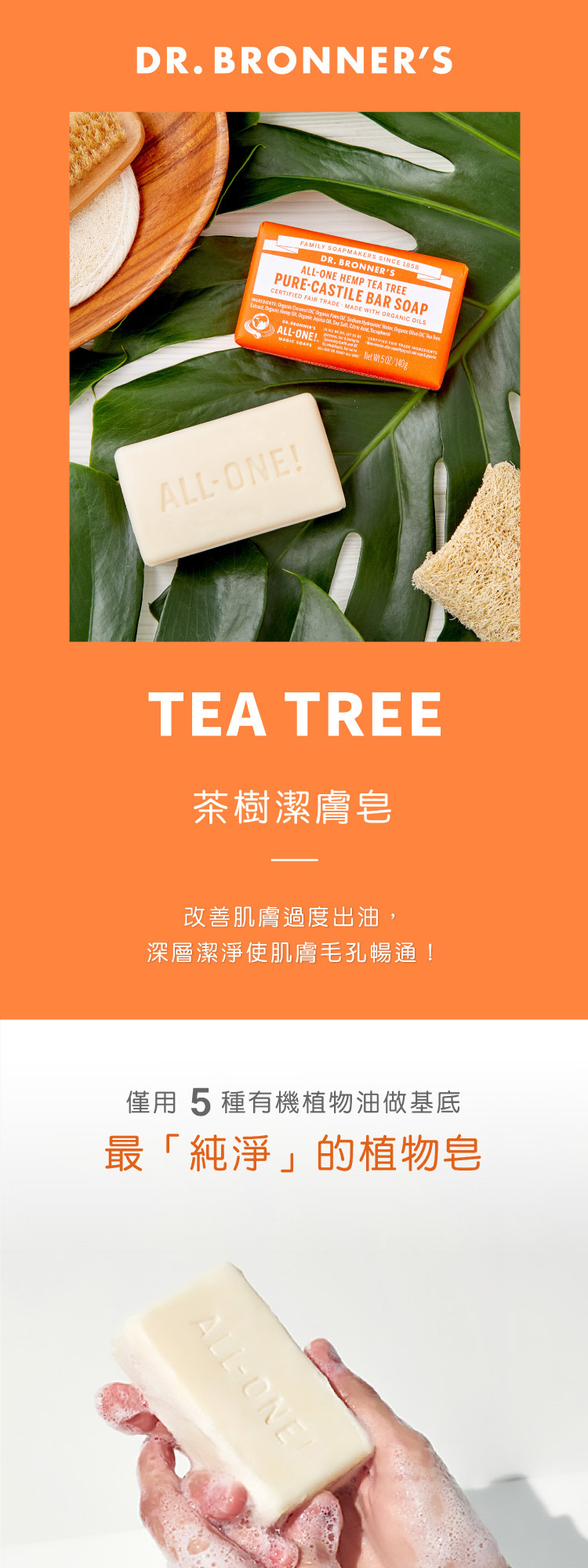 使用布朗博士茶樹魔法香皂,深層清潔淨化肌膚,煥活肌膚。本款魔法香皂泡沫豐富順滑,易於沖洗,讓肌膚清爽煥發。本品採用再生有機認證®植物油製成,並採用符合倫理道德標準的有機原料精製而成-不含洗滌劑、染料或添加發泡劑。本產品符合純素、有機、公平貿易和EWG®認證標準-因為潔淨的肌膚始於潔淨的成分。避免接觸眼睛。如果接觸到眼睛,請用清水沖洗15分鐘。如果刺激持續,請就醫。