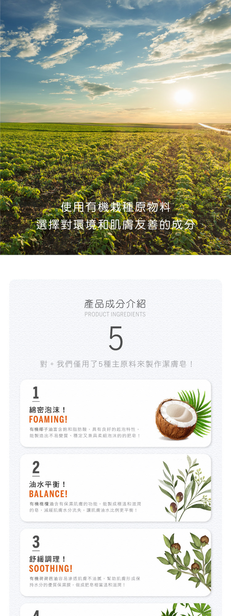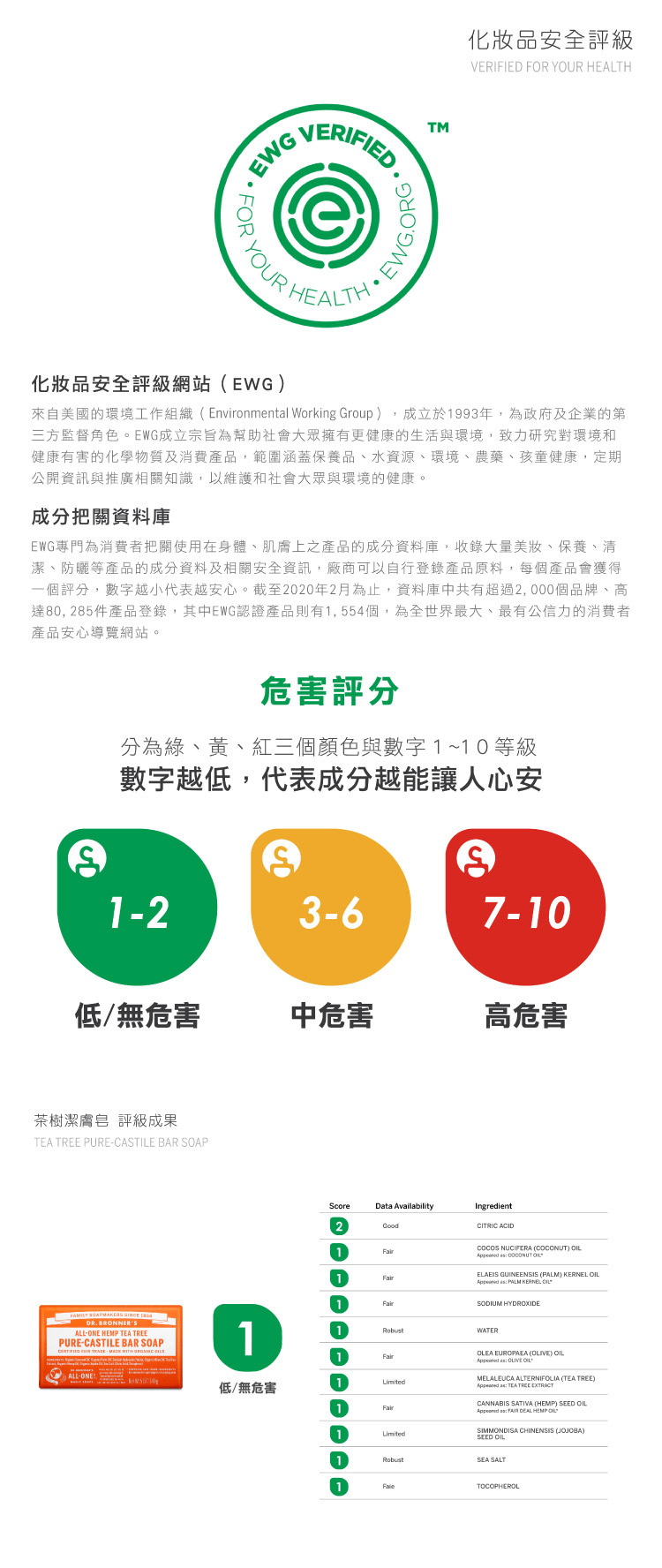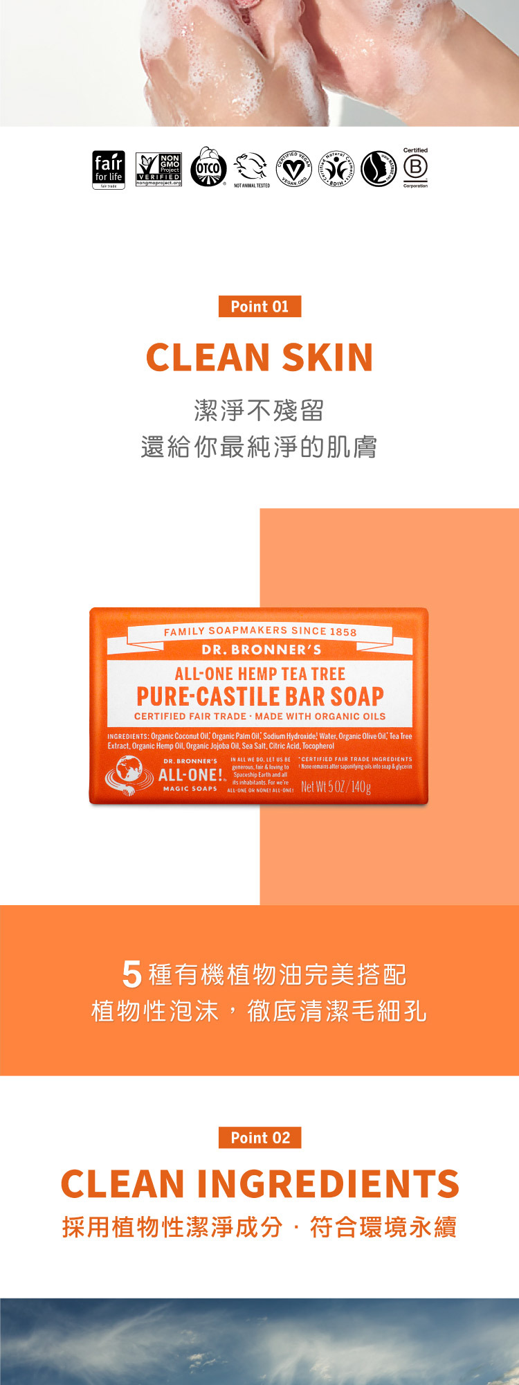 使用布朗博士茶樹魔法香皂,深層清潔淨化肌膚,煥活肌膚。本款魔法香皂泡沫豐富順滑,易於沖洗,讓肌膚清爽煥發。本品採用再生有機認證®植物油製成,並採用符合倫理道德標準的有機原料精製而成-不含洗滌劑、染料或添加發泡劑。本產品符合純素、有機、公平貿易和EWG®認證標準-因為潔淨的肌膚始於潔淨的成分。避免接觸眼睛。如果接觸到眼睛,請用清水沖洗15分鐘。如果刺激持續,請就醫。