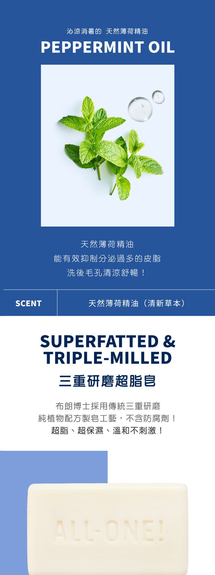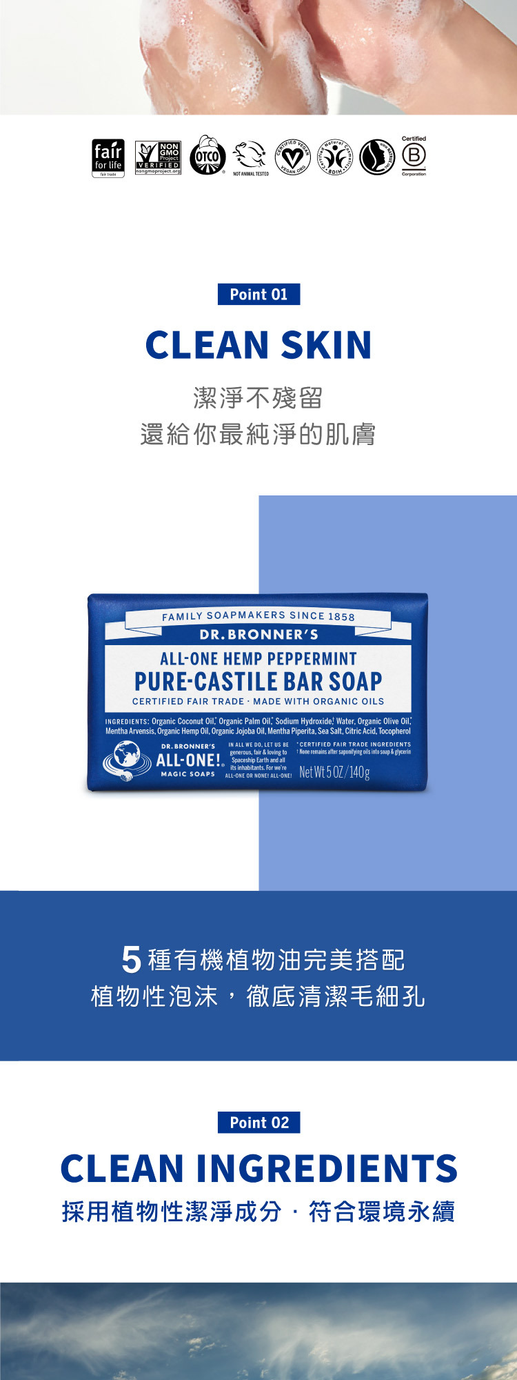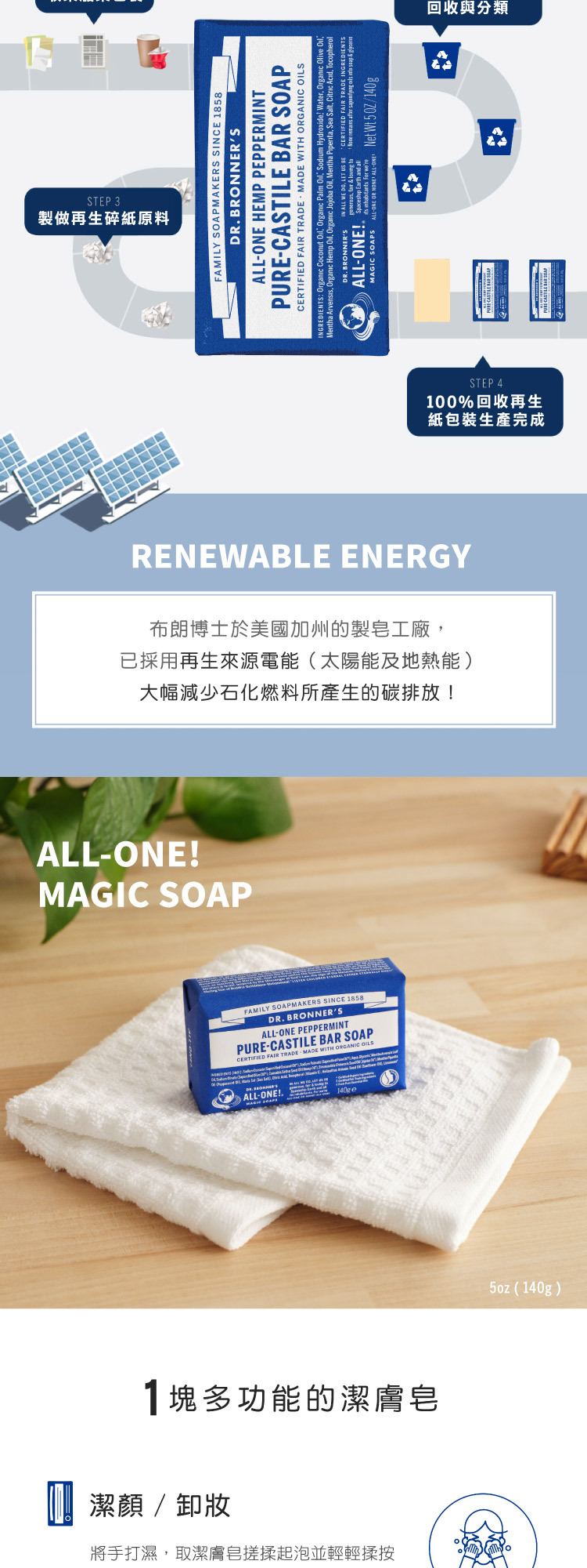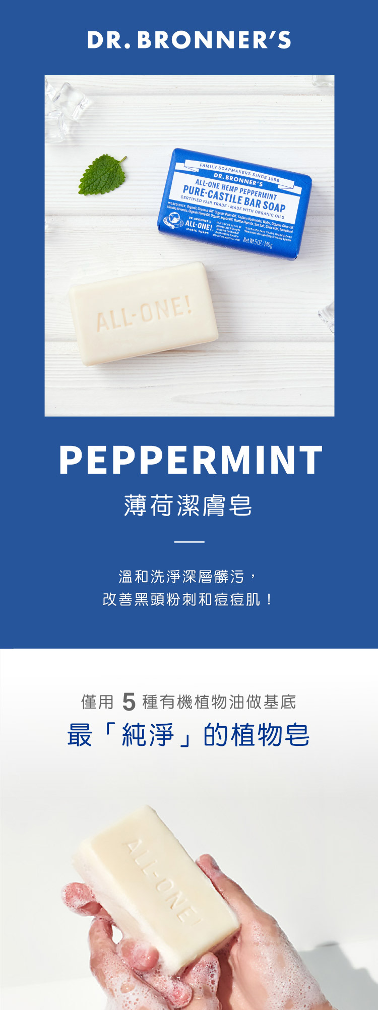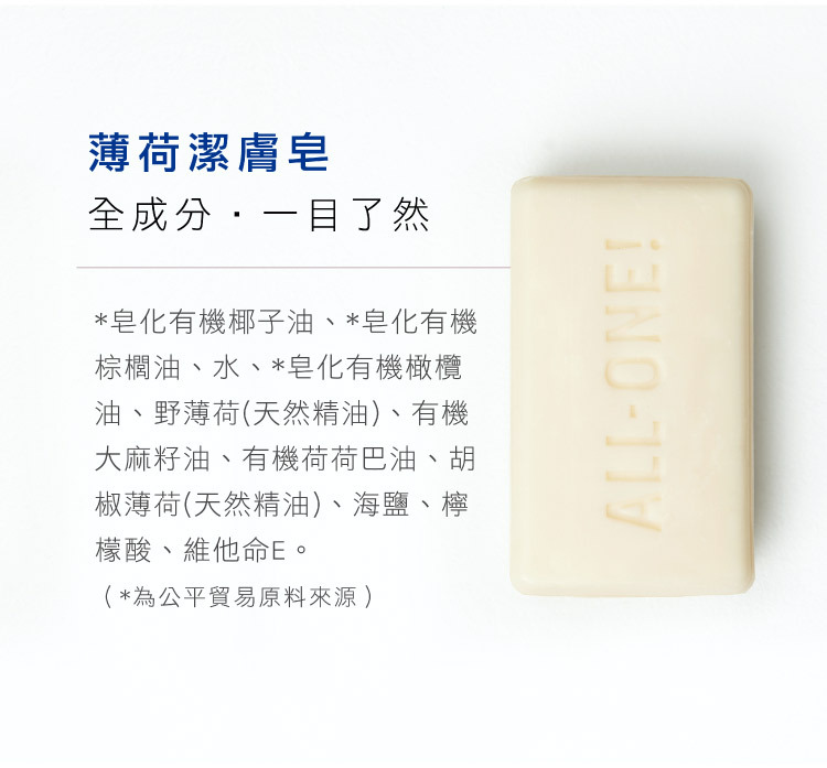 布朗博士薄荷魔法香皂蘊含有機薄荷精油,帶來清爽潔淨的觸感,讓肌膚清涼舒爽,喚醒感官。這款香皂採用再生有機認證® (Regenerative Organic Certified®) 的滋養配方,泡沫豐富順滑,易於沖洗,讓肌膚倍感清新煥發。本產品適合日常使用,採用符合道德標準的有機原料精製而成,不含任何洗滌劑、染料或添加發泡劑。本產品符合素食主義、公平貿易和 EWG Verified®標準,讓您安心無憂-因為呵護您的身體,也應該呵護地球!